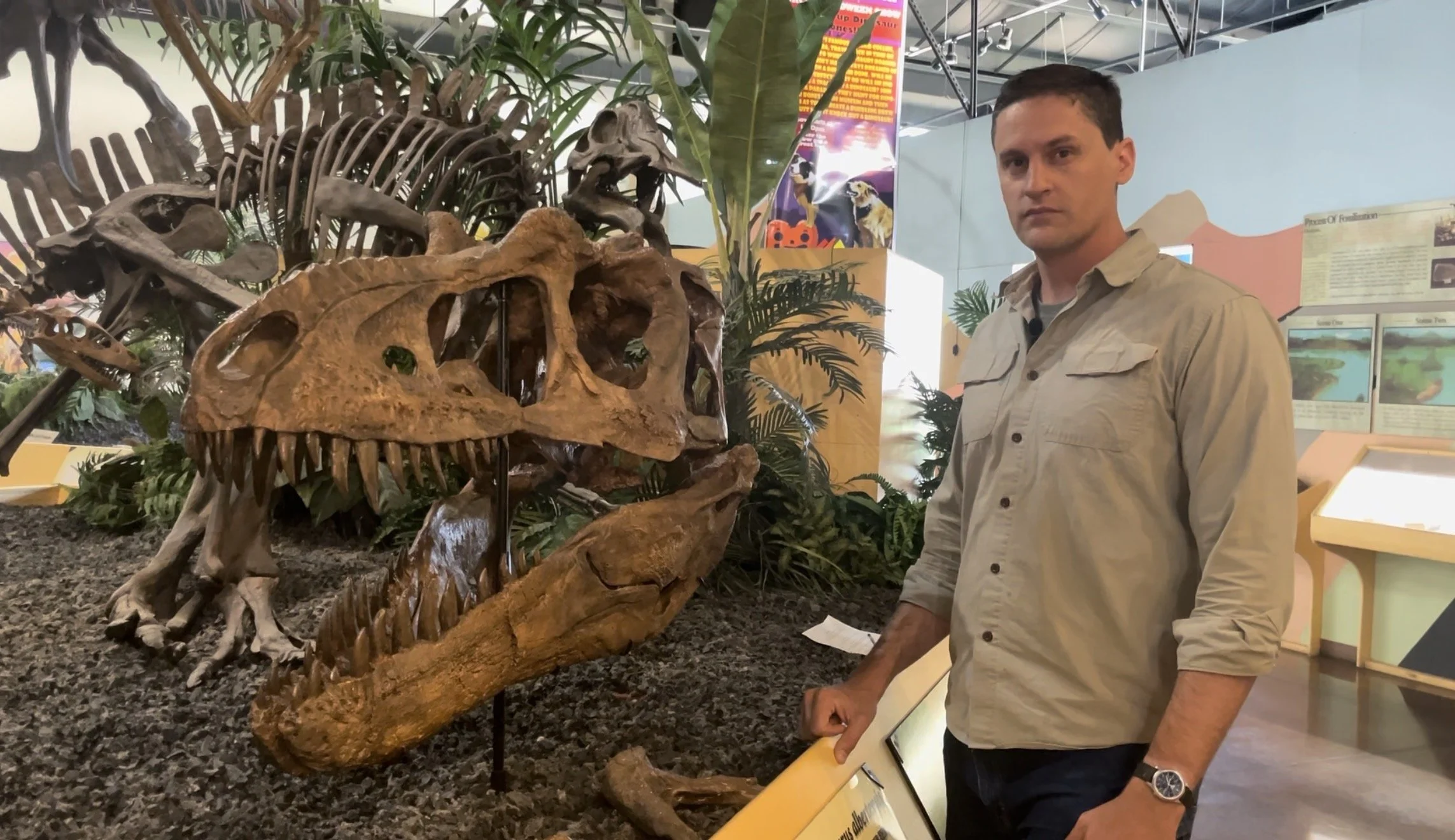 Jacob Jett, Executive Vice President, Corporate Development & Sales at Triebold Paleontology with the Sir William skull at TPI headquarters in Woodland Park, Colorado, United States.