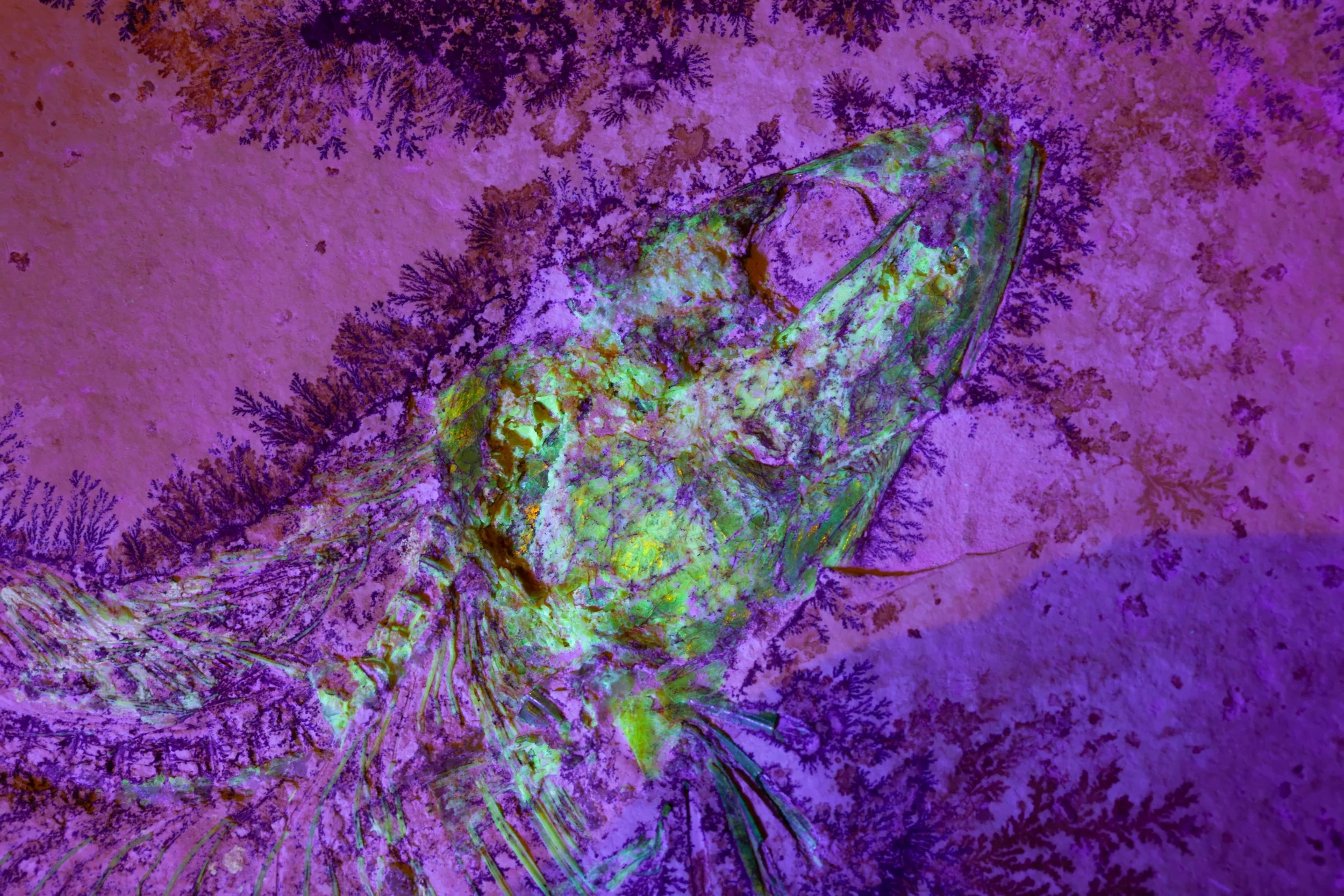 UV light reveals the original bone as glowing green for this fossilized fish from the Late Jurassic.