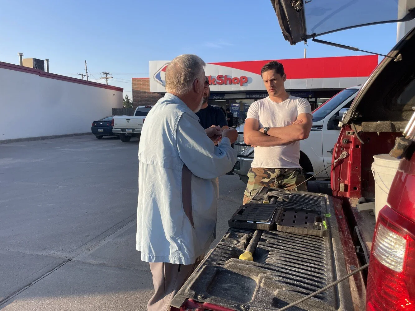 Jacob and Mike Triebold plan the days events with the locals in Dighton, Kansas